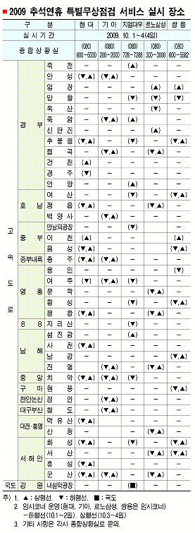 현대차는 다음달 1일부터 5일까지 투싼ix와 신형 쏘나타 등 300대를 공짜로 빌려주는 이벤트를 진행한다. 이달 28일까지 전국 주요 고속도로 화물 휴게소를 순회하는 화물차량 특별 무상점검 서비스도 실시한다. GM대우도 1일부터 5일까지 전국 고속도로 및 국도 휴게소 15개소에서 타이어 공기압 체크 등을 해주고 엔진오일과 냉각수 등 소모성 부품을 무상으로 교환 또는 보충해 준다. 르노삼성과 쌍용자동차 역시 1일부터 4일까지 각각 전국 7개와 8개 휴게소에서 차량 점검 서비스를 진행한다. 연휴 종합상황실 연락처는 ▲현대차 080-600-6000 ▲기아차 080-200-2000 ▲GM대우 080-728-7288 ▲쌍용차 080-600-5582 ▲르노삼성차 080-300-3000 등이다.