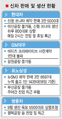 21일 자동차 업계에 따르면 르노삼성은 이달 생산 물량을 2만대로 늘려 잡았다. 이는 월 기준으로 올 들어 최대치이며, 창사 이래 두 번째 기록이다. 지난달보다 50% 많게 생산한다. 지난 7월 출시한 뉴SM3의 고객 주문이 폭주하고 중동 지역 수출 물량도 급증했기 때문이다. 뉴SM3는 지난 18일까지 3만 6697대의 예약 판매가 이뤄졌다. 하루 주문이 700대 이상 쇄도한다. 그러나 뉴SM3의 누적 출고대수는 현재 1만 1438대(하루 평균 230대)에 그치고 있다. 매일 500대 가까운 공급 부족이 발생한다.