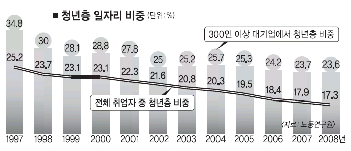 최근 청년층(만 15~29세) 일자리가 전체에서 차지하는 비중은 빠르게 감소하고 있다. 1996년 26.0%에서 지난해 17.3%로 떨어졌다. 같은 기간 300인 이상 대기업에서 청년층이 차지하는 비율도 36.7%에서 23.6%로 감소했다.