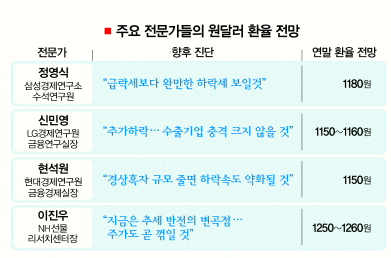 ■ 환율 향후 전망23일 원·달러 환율이 약 1년 만에 달러당 1100원대로 내려앉자 수출기업은 물론 유학생 자녀를 둔 ‘기러기 아빠’, 주식시장의 ‘개미’(소액 개인투자자)들도 촉각을 곤두세우고 있다. 대부분의 전문가들은 추가 하락을 점치면서도 속도는 완만할 것이라고 입을 모은다. “지금은 가장 경계해야 할 잔치 끝”이라며 연말 1300원대 재상승을 경고하는 목소리도 있다.