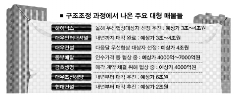 대우건설과 금호생명 매각을 추진 중인 금호아시아나 그룹이 대표적이다. 팔겠다고 내놓은 지 한참 지났지만 손들고 나서는 사람이 없다. 대우건설은 29일까지 인수의향서를 받을 예정이지만 외국계 자금 외에는 선뜻 나서는 사람이 없는 것으로 알려졌다.