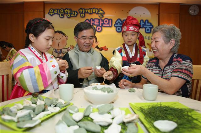우리은행은 29일 추석을 앞두고 저소득 가정 자녀와 독거 노인 50여명을 서울 회현동 우리은행 본점으로 초청, ‘사랑의 송편 나눔 행사’를 가졌다. 은행 측은 참석자에게 송편이 담긴 복주머니와 자매결연 마을에서 수확한 쌀·배도 선물했다. 이종휘(왼쪽에서 두번째) 행장은 “어려운 이웃들에게 풍성한 한가위를 만들어 주고 싶은 마음에 행사를 마련했다.”면서 “앞으로도 소외된 이웃과 함께하는 은행이 될 것”이라고 말했다. 우리은행 노동조합도 임직원이 함께 모금한 ‘우리사랑기금’으로 저소득 가정에 쌀 7t을 기증했다. 사회복지법인 굿네이버스를 통해 저소득 가정에 전달할 계획이다.