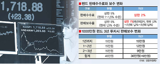 판매수수료는 지금도 2% 이하가 대부분이다. 반면 판매보수만 받는 1300여개 펀드 중 70%가량인 900여개 펀드는 매년 투자금의 1~2%를 판매보수로 받는다. 때문에 이번 조치로 판매수수료보다는 판매보수 인하 효과가 더 클 것으로 예상된다. 예를 들어 현재 판매보수가 연 1.5%인 판매사에 1000만원을 투자했을 경우 가입기간 내내 해마다 15만원씩을 떼어줘야 하지만 앞으로는 판매보수 부담이 최대 10만원으로 떨어지게 된다. 다만 펀드에 대한 장기 투자를 유도하기 위해 판매보수가 매년 일정 비율만큼 낮아지는 ‘체감식 판매보수(CDSC)’ 펀드에 한해서는 판매보수를 연 1.5%까지 받을 수 있도록 했다. 대신 투자 기간이 2년을 넘으면 1% 이하로 낮춰야 한다. 예컨대 지금은 1000만원을 3년간 펀드에 투자하면 45만원(매년 1.5%)의 판매보수를 부담해야 하지만 CDSC 펀드에 가입하면 36만원(첫해 1.5%, 1년 후 1.2%, 2년 후 0.9%)의 판매보수만 떼 9만원을 절약할 수 있다. 금융위에 따르면 지난해 기준 펀드 판매사의 보수·수수료 총액은 2조 1000억원이다. 이중 판매보수가 1조 8000억원에 이른다. 금융위는 이번 조치로 투자자들이 아낄 수 있는 돈을 연간 1000억~1400억원으로 추정한다. 이번 규정은 개정안 시행 이후 새로 출시되는 펀드에만 해당된다. 기존 펀드에는 적용되지 않는다. 이에 따라 기존 펀드를 환매한 뒤 유사 펀드에 새로 가입하는 투자자들이 늘어날 것으로 전망된다. 게다가 이번 개정안에는 투자자가 펀드를 환매하지 않고도 판매사를 자유롭게 이동할 수 있는 근거도 마련됐다.