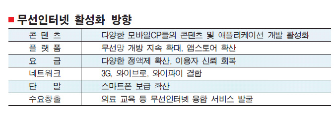 정부의 의지는 더 강하다. 방송통신위원회는 30일 ‘광대역 양방향 무선인터넷 청사진’을 내놓았다. 2013년까지 유선인터넷의 모든 것을 무선인터넷으로 끌어들이겠다는 것이다. 이를 위해 현재 이통가입자의 10%(450만명)에 불과한 정액제 이용자 비율을 2013년까지 40%(1800만명)로 늘리고, 스마트폰 보급 비율도 5%(100만대·햅틱, 아레나 등 고사양 단말기 포함)에서 20%(400만대)로 확대하기로 했다. 무선인터넷 콘텐츠 시장도 1조원에서 3조원으로 키운다는 복안이다.