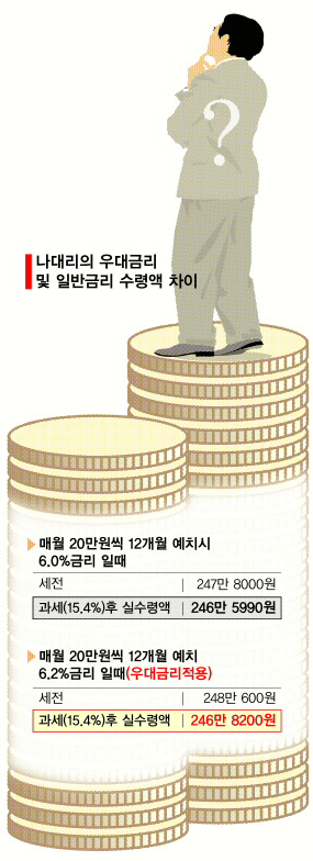 우선 나성실 대리의 부지런함과 성실함에 박수를 보낸다. 하지만, 과연 나대리는 오늘 올바른 재테크를 한 것일까. 대답은 ‘아니요.’다. 이날 0.2%포인트의 우대금리를 받은 나성실 대리가 점심시간을 활용해 얻어낸 금리는 연 6.2%다. 앞으로 12개월 동안 꼬박 20만원씩 적금을 부어 받을 수 있는 실수령액(세율 15.40% 적용 후 금액)은 246만 8200원. 반면 그냥 우대금리를 포기하는 대신 가까운 지점에서 같은 상품에 가입했을 때 1년 뒤 받을 수 있는 실수령액을 계산하면 246만 5990원(세율 15.40% 적용 후 금액)이다. 결국, 두 상품의 실제 수익 차이는 2210원에 불과하다.
