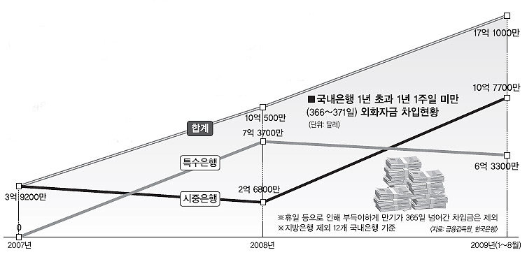 7일 국회 기획재정위원회 소속 백재현 민주당 의원이 금융감독원과 한국은행에서 제출받은 국정감사 자료에 따르면 지방은행을 뺀 국내 12개 은행(시중은행+특수은행)의 366~371일짜리 외화차입금 규모는 올 들어 8월까지 17억 1000만달러로 집계됐다. 지난해 연간 규모(13억 300만달러)를 이미 넘어섰다. 작년은 2월이 29일로 끝나는 윤년이었던 탓에 이례적으로 2007년과 2008년에 걸쳐 366일물 발행이 많았던 점을 감안하면 올해 증가세가 더 가파르다.
