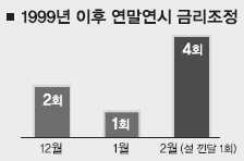 한은이 물가 안정 수단을 통화량에서 금리로 바꾼 1999년 5월 이후 지금까지 금리를 손 댄 것은 총 25회다. 인상이 11차례, 인하는 14차례였다. 세간의 주장대로 연말연시에 변경이 이뤄진 예는 극히 드물었다. 12월은 2005년(인상)과 2008년(인하) 두 번뿐이었고, 1월은 올해 딱 한 번이었다.