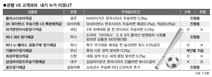 인천의 모아저축은행은 지난 5월 SK와이번스가 한국시리즈에서 우승하면 각각 0.3~0.6%포인트의 금리를 더 주는 예·적금 상품을 출시했다. 반대로 광주은행은 기아타이거스가 우승하면 금리를 0.3%포인트 더 주는 ‘플러스다모아적금’을 내놓았다.