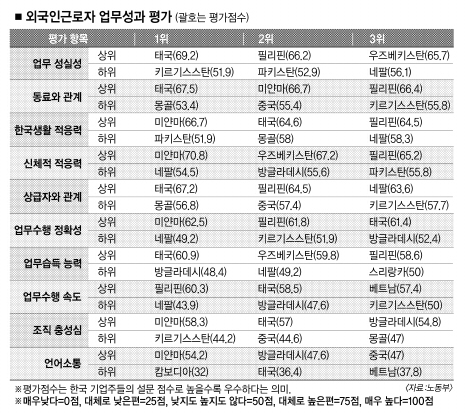 반면 방글라데시 근로자는 업무적응력이 높고 행동이 빠른 이들을 채용할 것을 권했다. 사업장 이탈(1위)이 적고, 똑똑(2위)하며, 언어소통능력(2위)이 상대적으로 뛰어난 점은 강점으로 꼽혔다.
