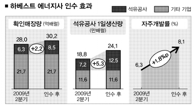 하베스트사 인수로 국내 기업들이 해외에서 생산하는 원유는 하루 18만 8000배럴에서 24만 1000배럴로 늘어난다. 올해 자주개발률 목표치(7.4%)를 뛰어넘었다. 아울러 석유개발에 관한 전문 인력과 오일샌드, CBM 개발 기술도 자연스럽게 확보하게 됐다. 특히 북미 석유개발 사업의 중심인 캐나다 캘러리에 거점을 확보함으로써 향후 해외유전 매입과 M&A 추진에도 가속도가 붙을 전망이다. 정부는 석유공사 대형화에 2012년까지 4조 1000억원을 투입할 예정이다.