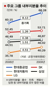 국내 재벌그룹의 내부지분율이 지난해보다 증가하는 등 기업 지배구조가 후퇴한 것으로 나타났다. 내부지분율이란 총수 일가와 계열사, 임원 등의 지분을 합한 것이다. 총수 일가의 지분율 자체는 떨어졌지만 계열사를 통한 장악력이 확대된 결과다.