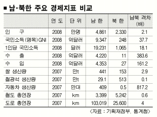지난해 명목 국민총소득(GNI)은 우리나라가 9347억달러, 북한이 248억달러로 37.7배가 차이 났고 1인당 GNI는 우리나라가 1만 9231달러로 북한 1065달러의 18.1배에 달했다.