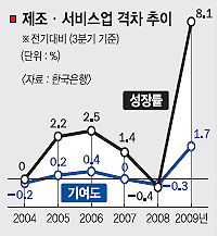 비록 재고 처분에 기댄 것이기는 하지만 제조업의 ‘선전’ 덕분에 우리나라는 경제협력개발기구(OECD) 회원국 가운데 글로벌 금융위기를 가장 빨리 극복한 나라로 떠올랐다. 하지만 서비스업과의 지나친 격차는 불균형 성장을 심화시키고 고용사정을 악화시킨다는 지적이다.