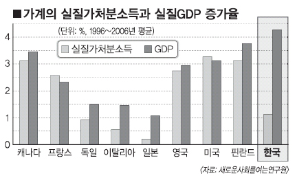 GDP의 ‘착시효과’는 우리나라에서도 발견된다. 우리나라의 경제성장률은 1980년대에 연평균 7.7%, 90년대에 6.3%, 그리고 2000년대에는 5.1%를 기록했다. 매년 7% 정도 성장을 계속하면 10년 뒤 두배만큼 성장한다는 점을 감안하면 한국 경제는 대략 1995년보다 두배가량 성장한 셈이다. 그러나 ‘새로운 사회를 여는 연구원’의 분석에 따르면 지난 10년 동안 우리나라 가계의 실질가처분소득은 1% 남짓 늘어나는 데 그쳤다. 경제성장이 개인의 행복과 소득 증진에 꼭 직결되지 않는다는 뜻이다.
