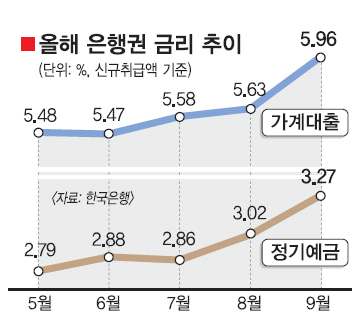 한국은행이 28일 내놓은 ‘9월 중 금융기관 가중평균금리 동향’(신규취급액 기준)에 따르면 예금은행의 대출 평균금리는 연 5.82%로 전달보다 0.21%포인트 상승했다.