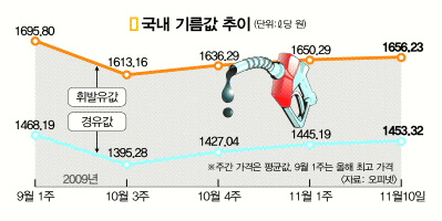 경유(자동차용)도 고공행진이다. 전국 주유소의 평균 경유값은 10일 기준으로 ℓ당 1453.32원으로 올해의 최고 고점(9월2일 1469.28원)에 거의 근접했다. 가격 상승세는 휘발유보다 더 가파르다. 지난달 15일에 단기 저점(1390.95원)을 찍고 무려 63원이나 올랐다.