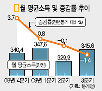 지난해 3·4분기(7~9월)에 우리나라의 가구당 월 평균 소득은 350만 6000원이었다. 하지만 올 3분기에는 345만 6000원으로 5만원이 줄었다. 그 사이 물가 상승률이 2.0%였으니 소득액도 최소한 그 정도는 늘었어야 작년 수준의 살림살이가 가능하다는 얘기지만 경기 침체로 그 만큼도 보장이 안 됐다는 것이다.