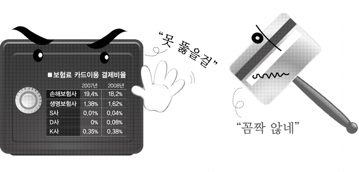 이런 이유로 보험료의 카드결제율은 극히 저조하다. 지난 10월 국회 정무위원회 소속 신건(무소속) 의원이 국정감사에서 공개한 내용에 따르면 생명보험사들의 신용카드를 통합 수납 비율은 1%대에 그친 것으로 집계됐다. 전체 보험료 중 2007년에는 1.38%, 지난해에는 1.62%만을 신용카드로 결제받았다. S생명은 지난해 0.04%만 신용카드로 결제를 받았으며, D생명은 0.08%였다. 그나마 손해보험사의 카드결제율은 20%로 생보사들보다는 나은 편이다.