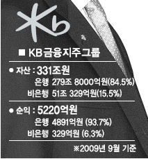 황영기 전 회장이 퇴임 전 사석에서 던진 말은 KB국민지주의 현실을 말해준다. 9월 말 현재 KB금융의 총자산은 331조원이다. 우리금융 지주 321조원, 신한금융지주 311조원인 것을 보면 부동의 1위 같지만 꼼꼼히 따져보면 내용은 다르다.
