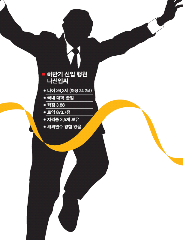 ‘나이 26.2세, 토익 874점, 학점 3.88, 자격증 3.5개를 가진 국내 대학 졸업생.’국민·우리·신한·하나은행 4대은행의 하반기 신입 행원 평균 ‘스펙’이다. 최악의 취업난 속에서 은행이 최고의 직장으로 꼽힌다는 점을 고려하면 은행원의 스펙은 예상보단 평범했다. 스펙보다는 인성을, 톡톡튀기보다는 조직에 잘 융화할 사람을 원하는 은행권의 보수적 인재관 때문이라는 게 전문가들의 대체적인 분석이다. 은행이 최종 합격자의 스펙을 공개한 것은 이번이 처음이다.