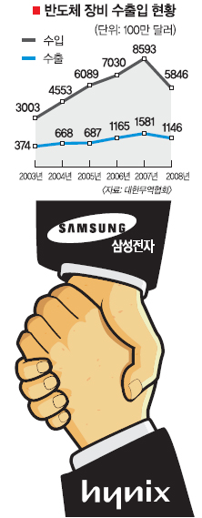 7일 지식경제부와 반도체업계에 따르면 삼성과 하이닉스는 반도체 장비업체인 유진테크와 디엠에스, 케시텍 등과 장비구매 계약을 조건으로 정부의 도움을 받아 핵심 반도체 장비를 공동으로 개발하기로 했다. 이는 정부-대기업-중소기업의 상생모델이어서 긍정적으로 평가된다.