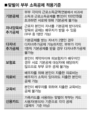 -배우자의 연간 소득금액 합계액이 100만원 이하인 경우에는 가능하지만 이를 넘으면 불가능하다. 여기서 소득금액은 단순한 수입금액이 아니라 비과세 소득 및 분리과세 소득을 제외한 것이다.