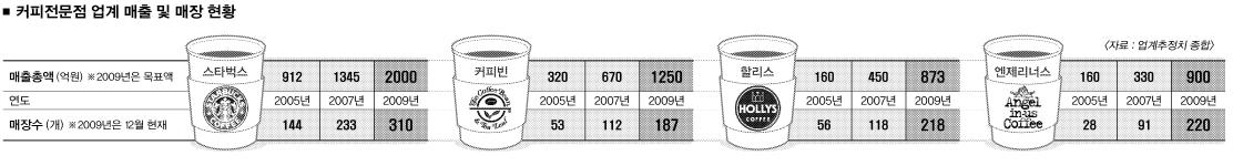 지난해 국내 커피시장 총규모는 1조 9000억원. 이 가운데 커피전문점은 5500억원의 매출로 28.9%를 차지했다. 커피전문점 시장의 비중은 갈수록 확대되는 추세다. 스타벅스(점포수 310개)와 커피빈(187개)으로 대별되던 시장은 엔제리너스(220개), 할리스커피(218개), 투썸플레이스(54개) 등 토종 브랜드가 급성장하며 뜨거운 각축전을 벌이고 있다. 지난해와 올해 매출액(목표액)을 비교해봐도 스타벅스가 1710억원에서 2000억원, 엔제리면스가 650억원에서 900억원 등으로 껑충 뛸 만큼 성장세가 계속되고 있다.