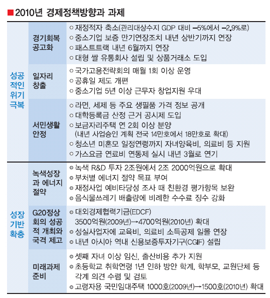 고용 창출능력과 고용의 안정성을 끌어올리기 위한 범정부 차원의 전략이 내년 상반기까지 수립된다. 민간의 고용 회복이 더딜 것으로 예상됨에 따라 당분간 정부의 일자리 지원도 계속된다. 희망근로(10만명)와 청년인턴(중소기업 2만 5000명, 공공부문 1만 2000명) 예산을 상반기에 조기집행하는 것이 대표적이다. 또 사업화 자금과 컨설팅 등을 지원하는 예비기술창업자 육성사업 대상자를 뽑을 때 중소기업에서 5년 이상 근무한 지원자에게는 가산점을 줄 예정이다. 취업대란 속에서도 중소기업에선 구인난을 겪는 모순적인 상황을 타개하기 위한 정책이다. 부처 간 갈등과 이익단체들의 반발로 꼬여 있는 전문자격사 시장 선진화 방안도 이른 시일 내에 확정할 계획이다. 또 아동발달 서비스, 간병 등 유망 사회서비스 분야를 선정해 지원 방안을 마련하고 방송사업 허가·승인 절차 투명화, 유료방송 이용요금 승인 제도 개선 등을 추진하기로 했다.