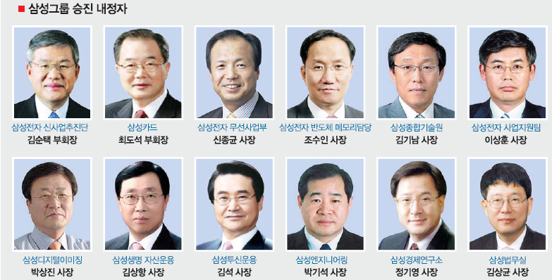 박기석 삼성엔지니어링 사장은 전문지식과 풍부한 해외영업 경험을 바탕으로 화공플랜트 사업의 발전을 이끌었다는 평가를 받았다. 신종균 무선사업부장 사장은 벤츠폰, 블루블랙폰, 울트라에디션 등 휴대전화 히트상품을 적기에 개발하는 데 크게 기여했다. 한편 삼성은 16일 부사장급 이하 임원에 대한 후속인사를 한다.