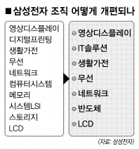 특히 3개 부문으로 쪼개져 있던 반도체 사업분야를 단일 사업부로 통합, 메모리와 비메모리 반도체의 시너지 효과를 높이기로 했다. 삼성전자 관계자는 “제품별로 분리됐던 기존 사업조직을 시장과 소비자의 욕구에 효과적으로 대응할 수 있도록 재편했다.”면서 “IT 제품의 시너지를 극대화하기 위해 디지털프린팅사업부와 컴퓨터시스템사업부를 통합한 IT 솔루션사업부를 신설했다.”고 설명했다.
