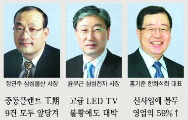 17일 재계에 따르면 대표적인 공격형 CEO는 윤부근(56) 삼성전자 영상디스플레이사업부 사장이다. 경제위기의 바닥이 보이지 않던 올해 초 대부분의 기업들은 ‘생존 경영’을 화두로 삼았다. 그러나 윤 사장은 역발상으로 프리미엄급 제품인 LED(발광다이오드) TV 출시를 밀어붙였다. ‘어려울 때 신제품을 내놔서 안 팔리면 망한다.’는 내부 반대에 대해서는 ‘불황기가 곧 기회’라는 논리로 설득했다. 삼성 관계자는 “경기가 빠르게 회복되는 환경까지 맞아 떨어지면서 위험 요인을 성공의 기회로 삼은 사례”라고 말했다.