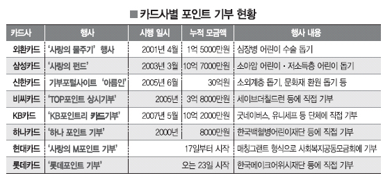 국내 포인트 기부제도는 2000년에 등장했다. 하나카드가 2000년, 외환카드가 2001년 시작했다. 하나카드는 굿네이버스 등 자선단체에 직접 기부하는 방식을 택했다. 외환카드는 ‘사랑의 물주기 행사’라는 이름을 붙여 심장병 어린이들의 수술비를 지원했다. 삼성카드도 2003년부터 ‘사랑의 펀드’라는 이름으로 백혈병 어린이 돕기와 다문화가족, 저소득층 어린이 후원사업 등을 펼쳤다. 하지만 2004년 카드 대란을 겪으면서 줄어든 카드 수만큼 카드포인트 기부도 침체기를 맞았었다.