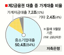 29일 금감원에 따르면 올들어 지난 9월까지 전체 저축은행이 빌려준 60조원 가운데 가계자금의 대출은 12%인 7조 2000억원에 불과하다. 반면 중소기업 대출은 84%가 넘는다. 저축은행이 그동안 서민대출은 외면한 채 프로젝트 파이낸싱(PF) 등으로 살아왔다는 얘기다. 게다가 2금융권은 최근 1년간 저신용자에 대한 대출을 계속 줄여온 것으로 나타났다. 신용정보회사인 한국신용정보에 따르면 지난 9월 현재 2금융권 전체 대출 중 저신용등급(7~10등급) 대출이 차지하는 비중은 21.8%로 지난해 9월 24.2%에서 2.4%포인트나 떨어졌다.