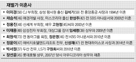 이재현 CJ그룹 회장의 누나인 이미경(58) CJ 부회장도 결혼 당시 삼성의 평사원이었던 김석기(59) 전 중앙종합금융 사장과 결혼했지만 갈라섰다. 정몽구 현대자동차그룹 회장의 3녀인 정윤이(48) 해비치호텔앤드리조트 전무는 1995년 현대정공에 입사한 신성재 전 현대하이스코 사장과 직장에서 만나 결혼했으나 두 사람은 2014년 3월 헤어졌다. 구자원 LIG그룹 회장의 장녀 구지연(50) 씨도 1989년 평사원과 결혼했지만 2년 만에 파경을 맞았다. 한편 지난해 말 불륜 사실과 혼외자 존재를 공개한 최태원 SK그룹 회장에 대해 부인 노소영 아트센터나비 관장은 이혼하지 않겠다는 뜻을 분명히했다.