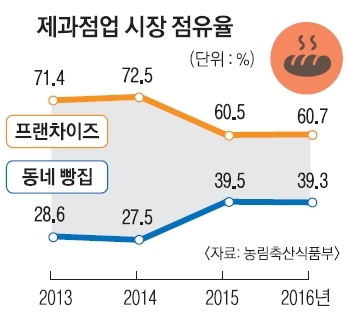 특히 프랜차이즈 빵집 매출액은 2013년 3조 260억원에서 2016년 3조 6034억원으로 19.1% 증가하는 데 그친 반면 동네 빵집 매출액은 같은 기간 1조 2124억원에서 2조 3353억원으로 2배 가까이 급증했다. 이에 따라 동네 빵집의 시장 점유율은 28.6%에서 39.3%로 10.7% 포인트 올랐다.