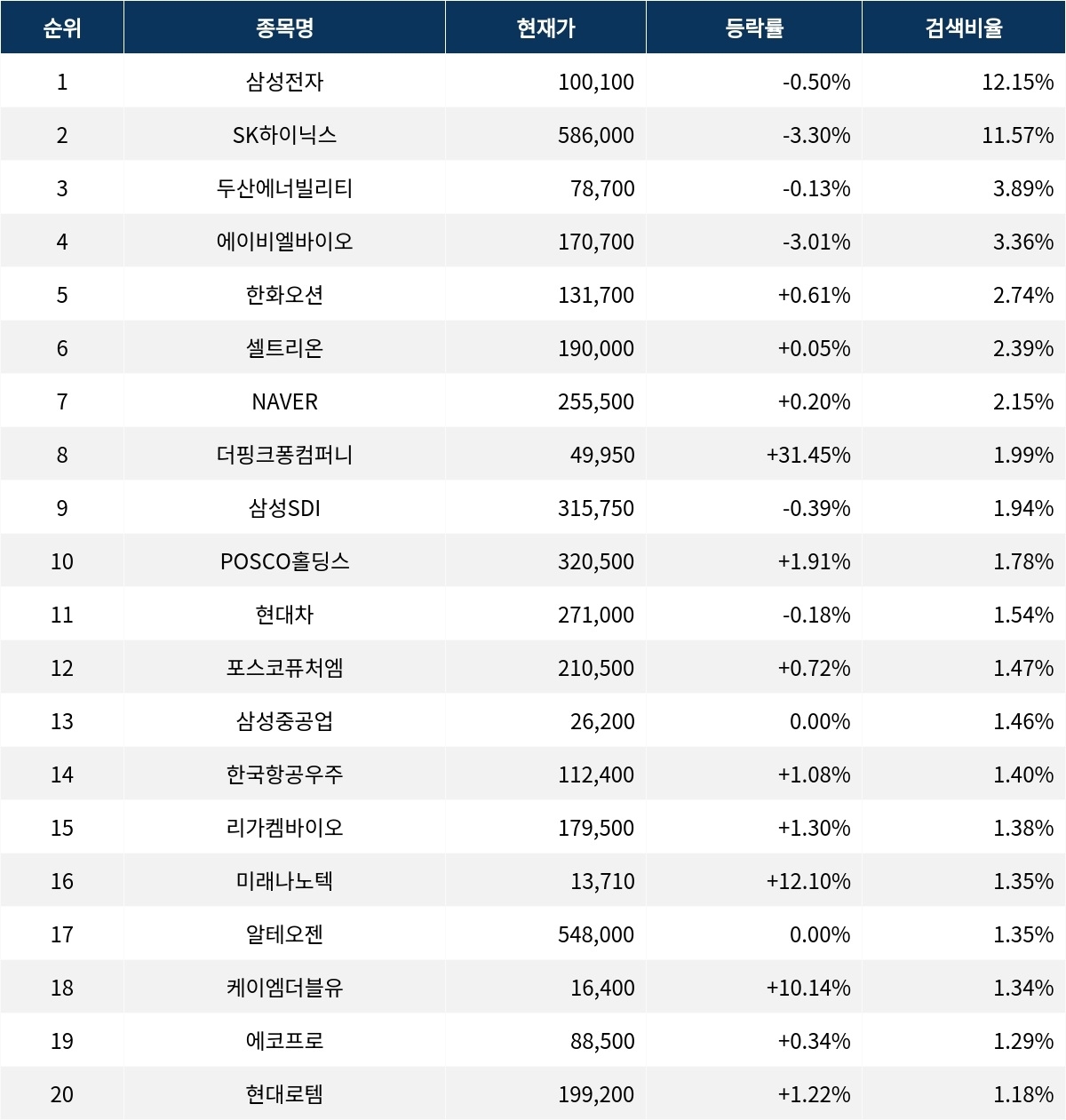 이어 SK하이닉스(000660)가 검색비율 2위를 기록하며 3.30%의 하락세를 기록하고 있다. 검색비율 3위의 두산에너빌리티(034020)는 0.13% 하락하며 큰 변동 없이 출발하고 있다. 검색비율 4위 에이비엘바이오(298380)는 개장 초반부터 3.01%의 하락세로 주가가 하락하고 있다. 검색비율 5위 한화오션(042660)은 0.61% 상승하며 순조롭게 출발하고 있다.