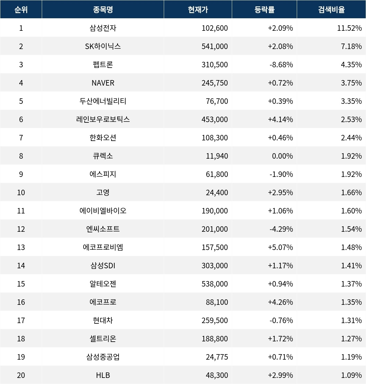 이어 SK하이닉스(000660)가 검색비율 2위를 기록하며 2.08%의 상승세를 기록하고 있다. 검색비율 3위의 펩트론(087010)은 -8.68% 하락하며 주가가 떨어지고 있다. 검색비율 4위 NAVER(035420)는 개장 초반부터 0.72%의 등락률로 보합세를 보이고 있다. 검색비율 5위 두산에너빌리티(034020)는 0.39% 상승하며 큰 움직임을 보이지 않고 있다.