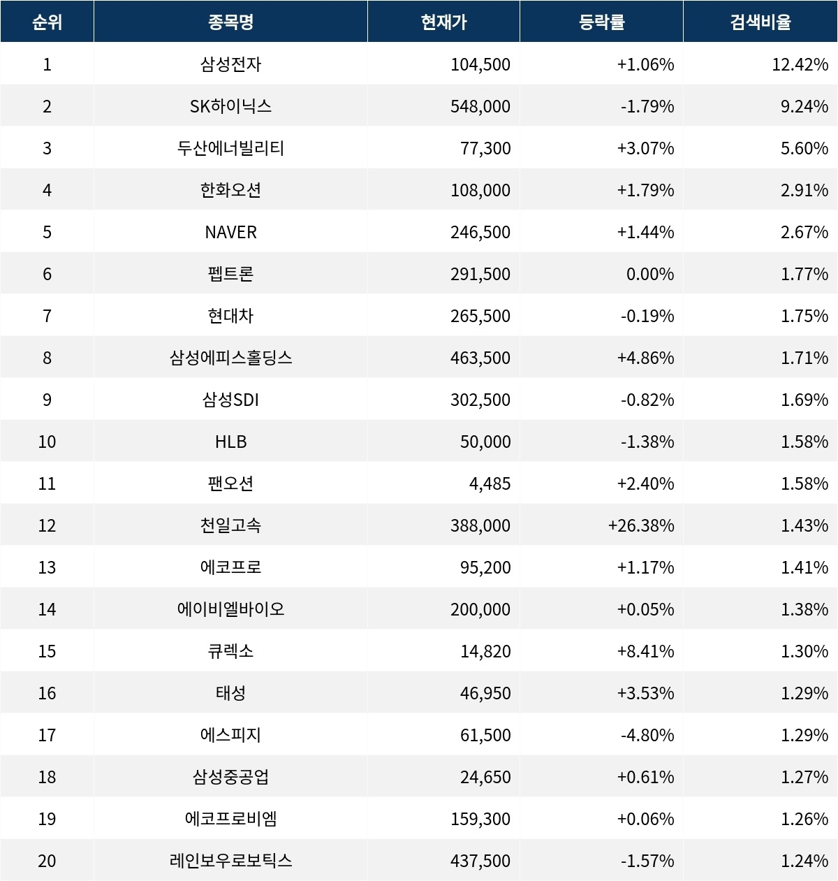 이 밖에도 천일고속(000650) ▲26.38%, 큐렉소(060280) ▲8.41%, 태성(323280) ▲3.53%, 팬오션(028670) ▲2.40%, 두산에너빌리티 ▲3.07%, 에코프로(086520) ▲1.17%, 삼성중공업(010140) ▲0.61%, 에이비엘바이오(298380) ▲0.05%, 에코프로비엠(247540) ▲0.06%, 레인보우로보틱스(277810) ▼1.57% 등이 많이 검색되고 있다.