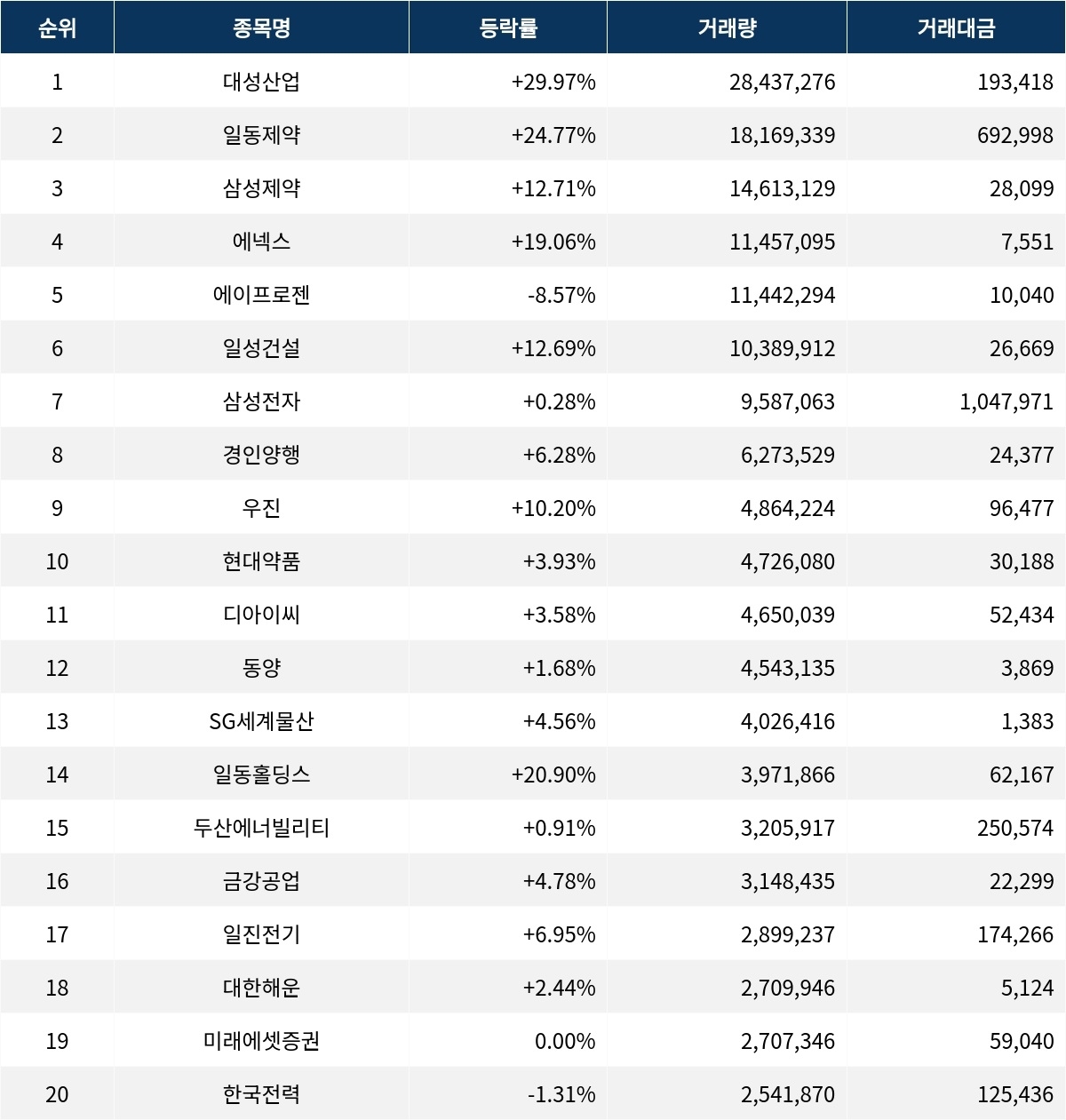 삼성제약(001360)은 현재가 1,978원, 등락률 12.71%, 거래량 14,613,129주로 거래량 3위를 기록하고 있다. 에넥스(011090)는 656원으로 19.06% 상승하며 11,457,095주가 거래되었다. 에이프로젠(007460)은 등락률 -8.57%로 11,442,294주 거래되며 하락세를 보이고 있다. 삼성전자(005930)는 현재가 108,300원, 등락률 0.28%, 거래량 9,587,063주로 비교적 안정적인 흐름을 보이고 있다.