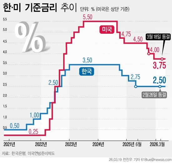 미국 중앙은행인 연방준비제도(Fed·연준)가 18일(현지시간) 지난 1월에 이어 이번에도 기준금리를 동결했다. 중동 전쟁으로 국제 유가가 급등해 물가 상승이 우려되고 고용마저 둔화했기 때문으로 풀이된다. 이에 따라 한국은행도 당분간 동결 기조를 이어갈 가능성이 커졌다.