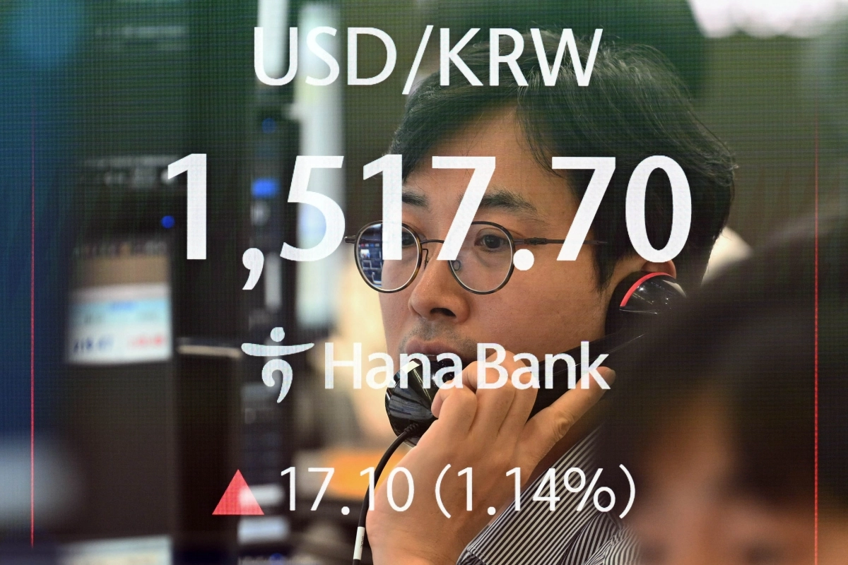 중동분쟁 불확실성 고조로 2009년 금융위기 이후 처음으로 원·달러 환율이 1510원을 돌파한 23일 오후 서울 중구 하나은행 딜링룸 전광판에 원·달러 환율이 표시되어 있다. 이날 서울외환시장에서 원·달러 환율은 1517.3원에 주간거래를 마쳤다.