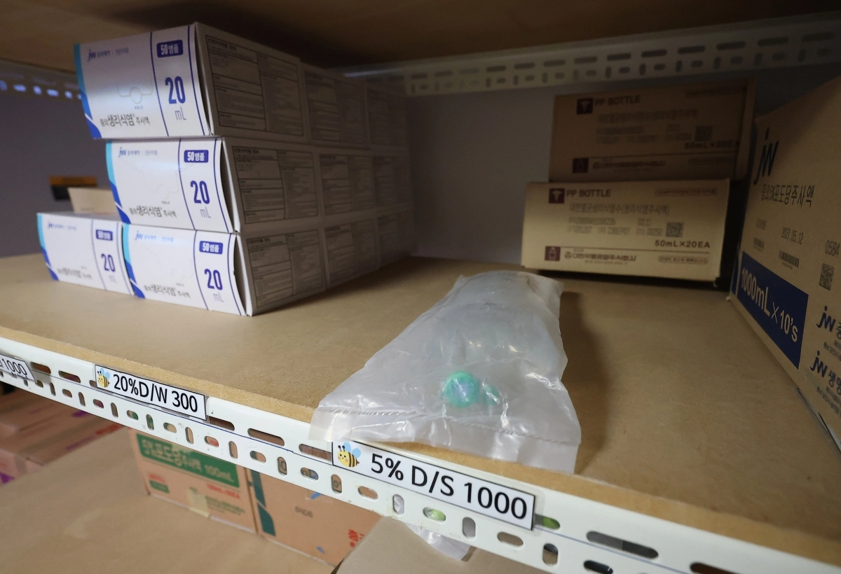 중동전쟁 여파로 나프타 수급이 어려워져 수액 등 의료 제품의 필름 포장재 가격이 급등하고 있다. 사진은 7일 서울의 한 대형병원 보관 창고에 수액이 몇 개 남아 있지 않은 모습.
