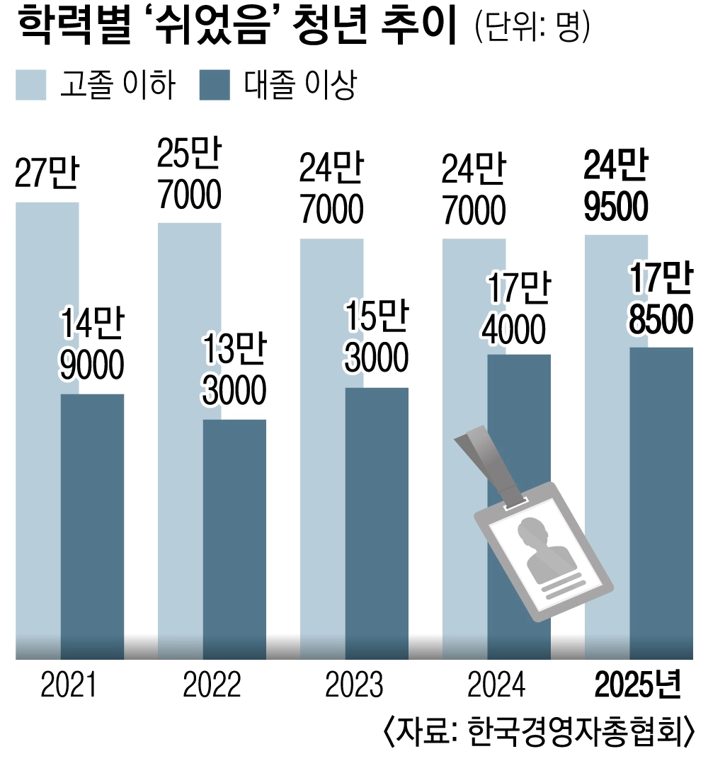 특히 지난 5년간(2021~2025년) 고졸 이하에서 ‘쉬었음’ 청년은 27만 명에서 24만 9500명으로 감소했지만, 대졸 이상은 14만 9000명에서 17만 8500명으로 늘었다. 이에 대해 경총은 대학 진학률이 70%를 넘은 가운데 고학력 청년의 과잉 공급을 이유로 꼽았다. 기업 간 벌어지는 임금 격차도 고학력 청년들이 노동시장을 외면하는 원인이다. 지난해 대기업 정규직 청년의 시간당 임금(2만 125원)은 중소기업·비정규직 청년(1만 4066원)보다 약 43% 높았다. 이에 청년들이 중소기업 취업을 기피하고 대기업·공공기관 진입을 위해 장기 구직에 매달리고, 결국 하향 취업 대신 ‘쉬었음’을 택하는 고학력자가 늘어난다는 것이다. 대졸 공채가 줄고 경력 채용이 늘어난 점도 고학력 청년의 노동시장 이탈 요인으로 보인다.