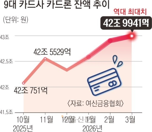21일 여신금융협회에 따르면 삼성·신한·현대·KB국민·롯데·하나·우리·BC·NH농협 등 9개 카드사의 지난달 말 기준 카드론 잔액은 42조 9941억원으로 집계됐다. 이는 전월 말(42조 9021억원)보다 920억원 늘어난 수치로, 지난해 2월 기록한 종전 최대치(42조 9888억원)를 웃도는 수준이다. 카드론 잔액은 올해 1월(42조 5850억원), 2월(42조 9021억원)에 이어 3개월째 증가세다.