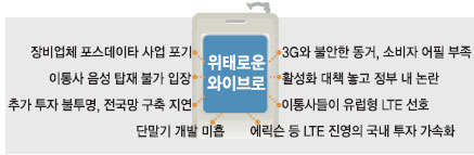 올 들어 한국형 와이브로는 미국, 중국, 중남미, 중동 지역에서 선전하며 아직 상용화되지 못한 경쟁 기술인 유럽형 LTE(롱 텀 에볼루션)를 따돌리는 듯했다. 하지만 국내 시장에서는 좀처럼 돌파구를 찾지 못했다. 2005년부터 상용화한 KT(21만 9000명)와 SK텔레콤(1만 5000명)의 와이브로 가입자는 23만 4000명에 불과하고 매출은 300억원 안팎이다. 음성서비스를 하기 위해 꼭 필요한 전국망 구축도 난망한 상황이다.