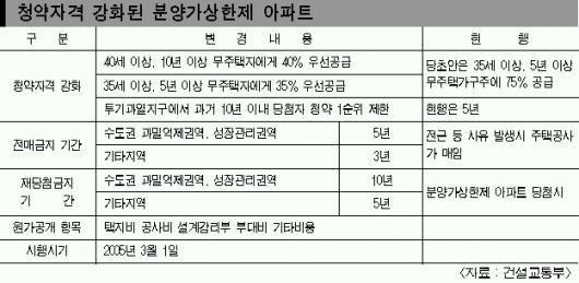 법 개정의 취지는 실수요자, 특히 무주택자들의 청약기회 확대다. 당초 35세 이상,5년 무주택자로 했던 우선청약자격을 40세 이상,10년 무주택자로 세분화한 것과 투기과열지구내 분양가상한제 적용 아파트는 10년 이내 아파트 당첨사실이 있으면 1순위에서 제외키로 한 것이 대표적인 예이다.