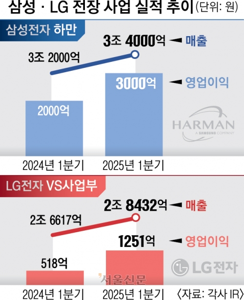 4일 업계에 따르면 올해 1분기 삼성전자의 전장·오디오 자회사 하만은 매출 3조 4000억원, 영업이익 3000억원을 기록했다. 이는 TV와 생활가전을 담당하는 VD·DA사업부의 1분기 영업이익(3000억원)과 같은 수준이다.