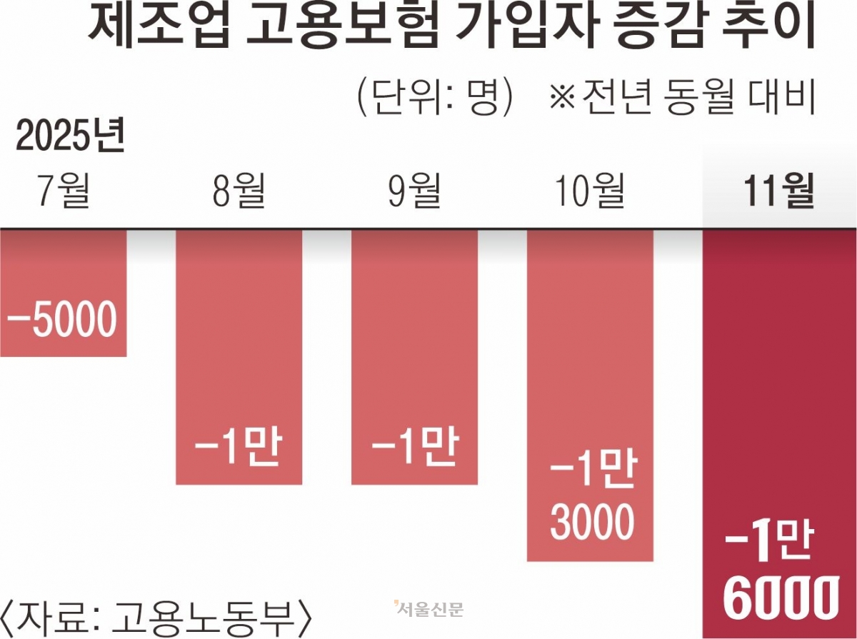 고용노동부가 8일 발표한 ‘11월 고용행정 통계로 본 노동시장 동향’에 따르면 지난달 제조업 고용보험 가입자는 384만 5000명으로, 전년 동월 대비 1만 6000명 감소했다. 고용허가제로 입국한 외국인 근로자를 제외하면 제조업 내국인 감소 폭은 3만 1000명에 이른다. 현장에서 체감하는 고용 위축이 더 심각하다는 의미다.