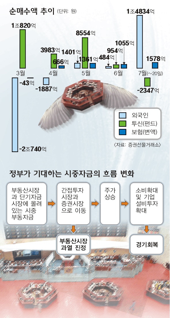 정부는 총 421조원으로 추산되는 시중 부동자금 가운데 부동산 투기와 단기자금 시장에 몰려 있는 돈이 간접투자(펀드)와 주식시장으로 이동하기를 기대하고 있다. 그러면 주가도 오르고, 소비 확대와 기업의 설비투자 증대 효과도 얻을 수 있기 때문이다. 그러나 부동산으로 흘러들어간 자금이 곧바로 증시자금으로 전환되기는 쉽지 않을 것으로 보는 전문가들이 더 많다.