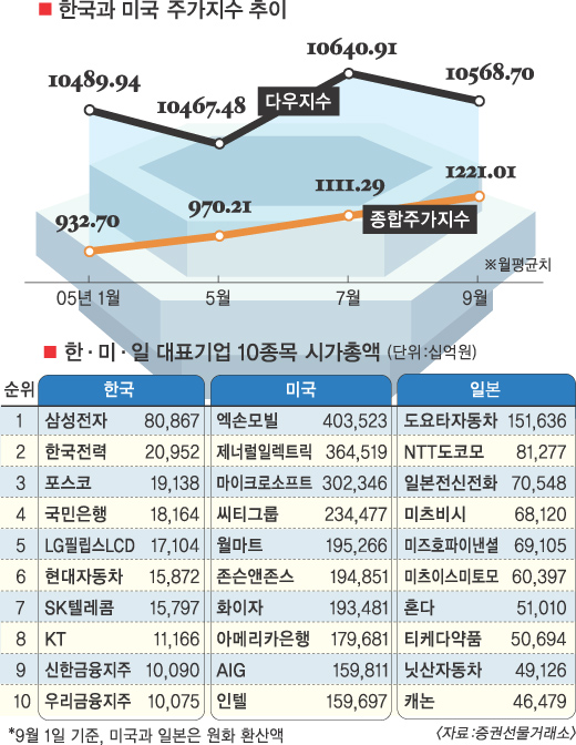 국가경쟁력과 견주면 삼성전자는 세계 무대에서 대견하게 버티고 있는 셈이다. 그렇지만 국내 기업들이 주식의 총가치에서 엑손모빌을 누르려면 삼성전자를 포함해 상위 30개 상장사가 모두 달려들어도 모자란다.30대 기업의 시가총액은 336조 4200억원. 미국 30개 상장사(약 4670조원)의 7.2%, 일본 30개 상장사(1228조원)의 11.1%에 불과하다.
